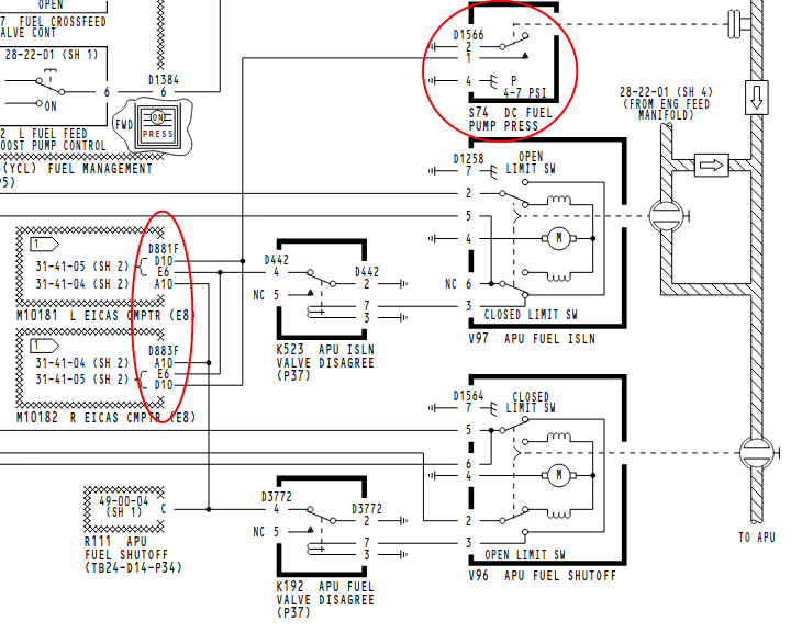 The three pins feeding the EICAS computers for APU fuel feed are....