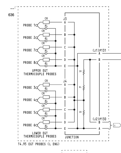 For the life of me, I cannot remember how the EGT thermocouple gang does it’s job. There are 4 probes in parallel all connected to one output on a CF6-80C2. If one probe is removed from the equation, does the temperature indicated go up or down?