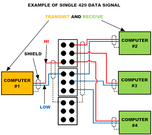 With either the red (high) or blue wire grounded, the data from the transmitting unit will not be seen by the users. I have also seen in the past where a user system component will have a shorted or bad 429 receiver circuit which takes the whole bus down.