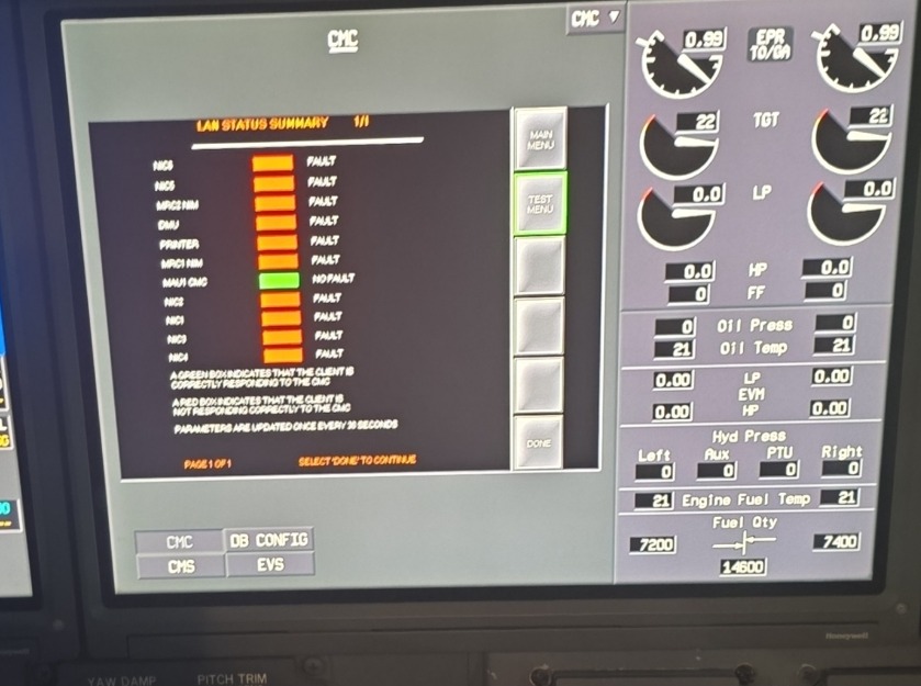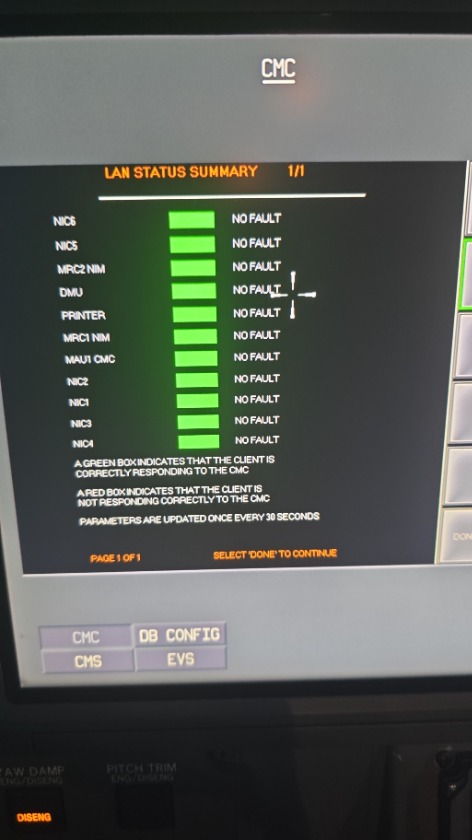 The CMC was showing 4 messages for LAN failure DMU, Printer, NICMRC2, NICMRC1. All Lan were showing inop as well.