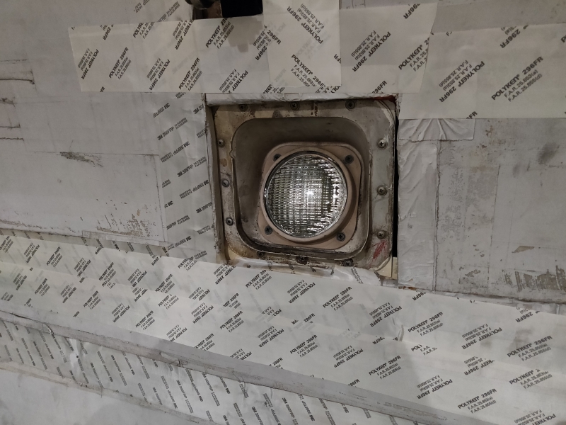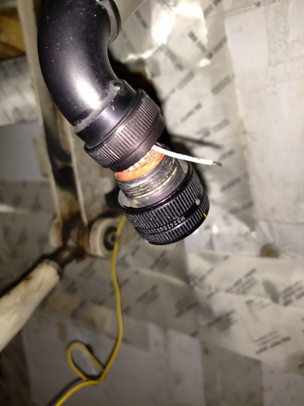 The harness does "not" have a corresponding disconnect plug on the aircraft side. It's "hard wired" down to the door light control box on the aircraft's right side-wall. We started gutting both the overhead and side-wall looking for the ground stud associated with the pin 21 wire.