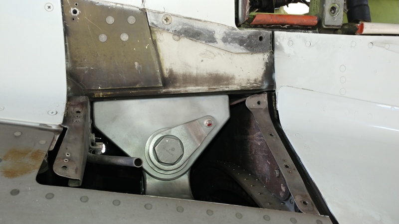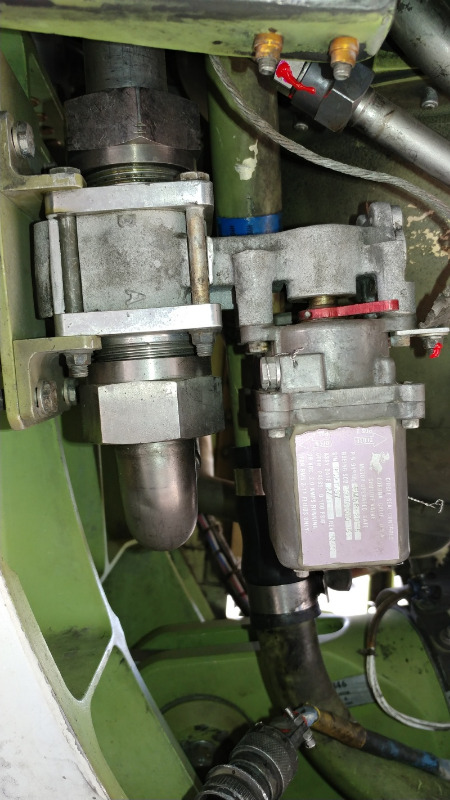 The valve itself slides in between two hydraulic line flanges Only two adjoining bolts require removal (the easiest ones of course, are the ones visible in this picture. (We did have to loosen the upper flange nut to allow the bolts to catch a flat for clearance. The nut is 2".)