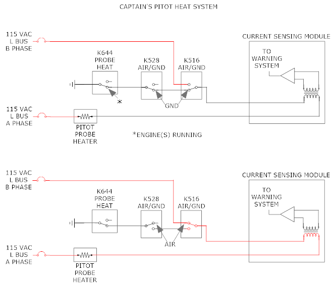 The confusing aspect of this is how it functions in the air mode. Once the aircraft is off the ground, both air/ground relays relax. At that time the previous supplied ground is replaced with 115 VAC (B phase) power. I "do not" understand how this is possible. You have two phases of power acting across a heater coil. Exactly how does current flow??? It must, because the current sensing module has to see current flow to keep the "Pitot Heat Off" light extinguished.