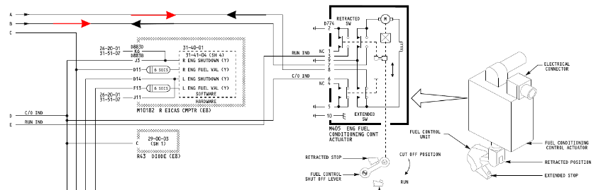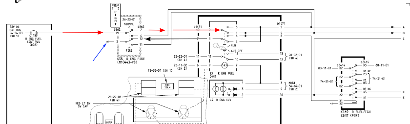 If you look at the prints you'll see that with the fire handle pulled, the switch is by-passed. Power is sent directly to pin 7 and ground on pin 8 to retract the actuator and shut off the engine.