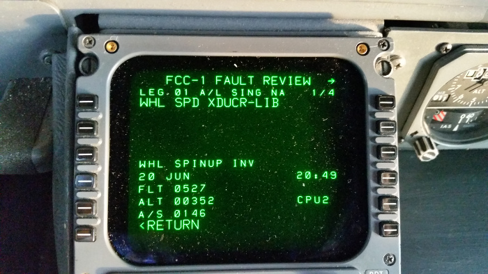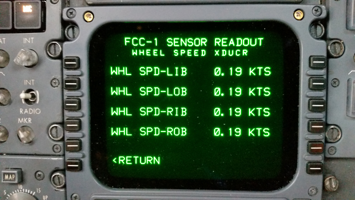 The left inboard does show "something" in the image above, but all the tires are at rest. The failure would most likely be either a sheared transducer shaft or a open signal coil. There would be no speed increase as with the other three tires. The FCC's would log this fault almost instantly. All the flights referenced for this failure had the fault recorded before 500' of altitude.
