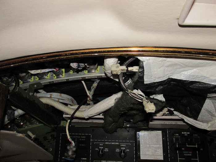 The center and left aft cockpit headliner panels need to be removed of pushed aside to gain-access-to (my favorite words in aviation) the panel disconnect plugs (4ea, 2 left, 2 right) mounted on the frame rib. Gulfstream didn't exactly provide a ton of room between the plugs, so using any type of cannon plug pliers for plug removal is impossible.