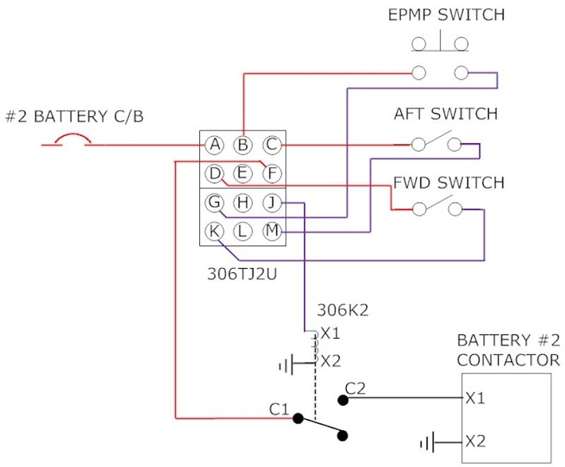 A GIV was having a growing problem with the #2 battery not coming on via the EPMP switch. Luckily, it was failed at the beginning of troubleshooting. I went straight for terminal block 306TJ2U located behind the F/O's seat. Power was present on terminals A-F which is actually hot battery bus power and always present with batteries (in this case #2) connected. With the EPMP switch pushed in, no power was on the lower terminals G-M. Flipping on either outside battery switch kicked both batteries on. All three switches are wired in parallel from the terminal block and either of them will engage relay 306K2 which feeds power to the contactor.. A battery contactor can be eliminated as a culprit easily in this case, but it certainly would be suspect if no engagement was accomplished by trying all three switches.