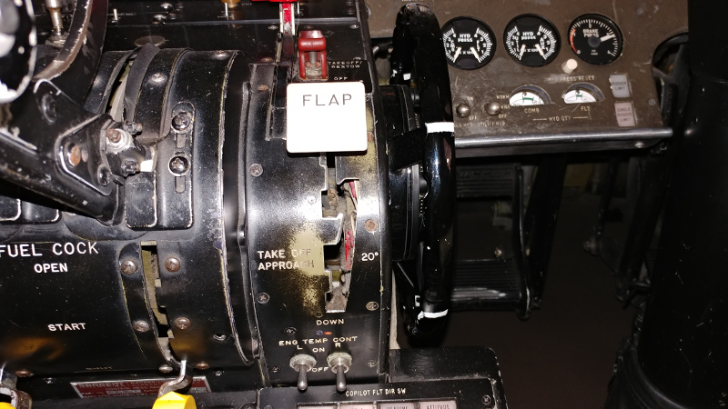 In the forward wheel well (right aft) is the flap control valve. The emergency handle rod can be seen connecting to the lower section of the assembly.