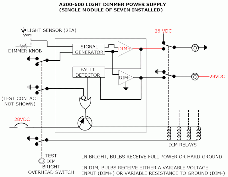 The same can said for bulbs that have a ground supplied by the controlling system. In bright they receive a full 28VDC from the dimming box module. In dim, that voltage is reduced by another amp (DIM+) in the associated module.