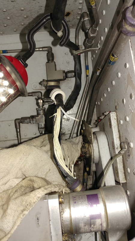 A repair was completed on both wires, but I suspect that more will break over time. This area is where the wire bundle moves and bends in response to gear retraction/extension. I'm not sure if any plausible solution is available other than changing placement and slack of the bundle itself. There is a pronounced bend aft of the lower adel clamp.