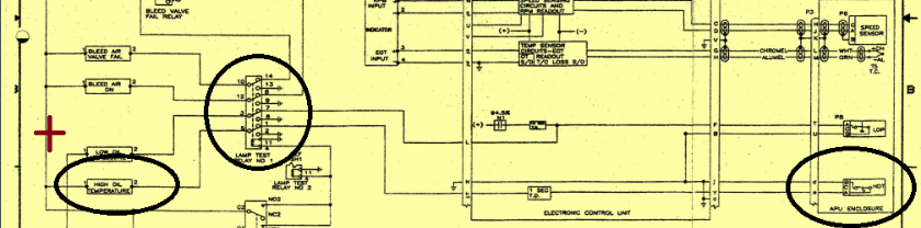 I found it a little puzzling at first after reading the WDM and the APU trouble shooting manual seem to contradict each other. As I read the print it looks to me like when the switch is closed the ground is provided to the light causing it to illuminate. Although when you read the trouble shooting manual it reads that the switch is in the closed position when cold and opens when overheated. I will just have to assume that some magic that is not depicted takes place in the APU ECU to make the light illuminate.