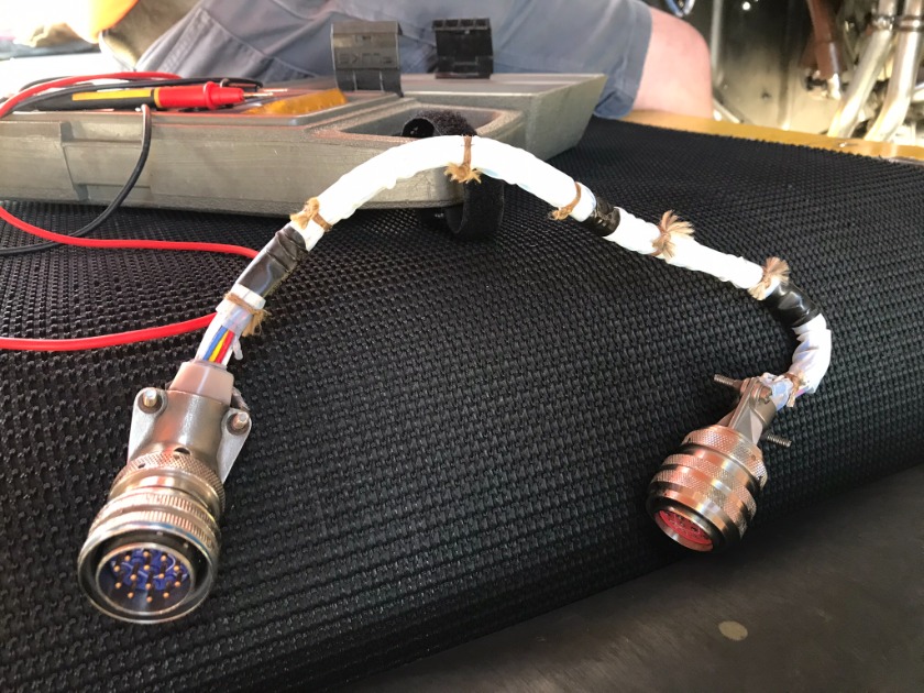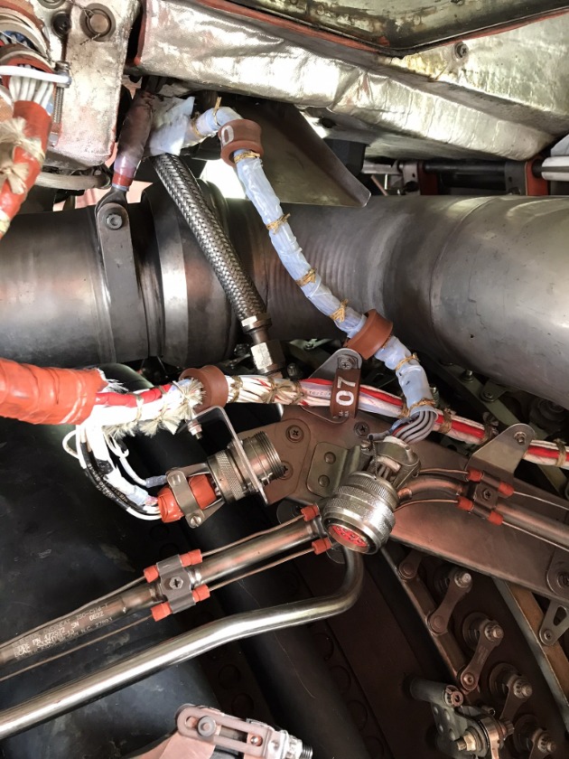 The jack is in a difficult access area, close to the structure at the top with a bleed air duct below. The jumper modification brings this pylon connection lower and outboard.