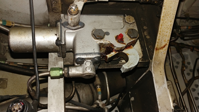 Left main gear up-lock switch with plug hanging off. The proximity switch is located in the silver barrel on the left side of the hook actuator assembly.