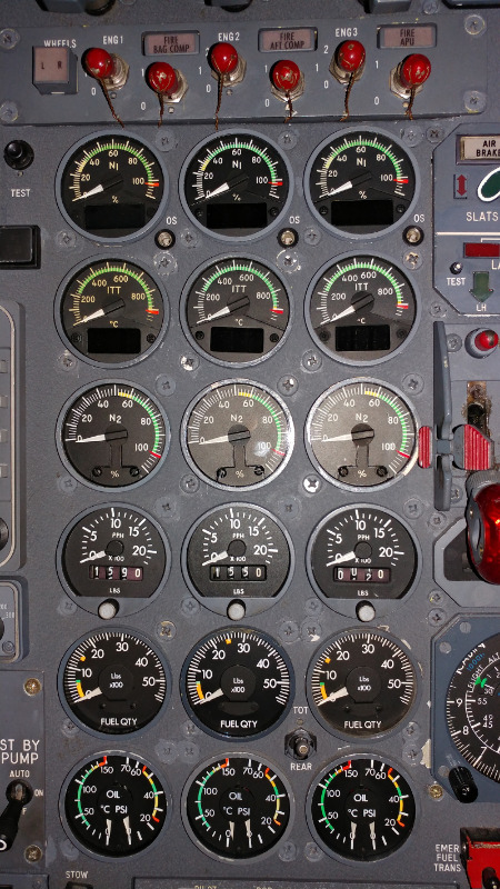 The instruments involved in this case were the three Fuel Flow indicators and the three Fuel Quantity indicators right below the flows. (I'm not sure about Falcon's thinking on this, the upper instruments are controlled from the Left/Center knob on the pilot's side..... couldn't they have been combined the center instruments under "one" control knob?)