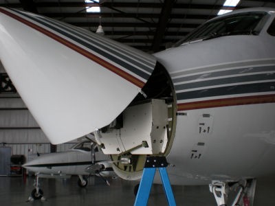 The transponders on a GIV are located under the radome, aircraft left, on the top shelf.