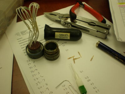 Rack plugs. Strapping is accomplished on the P-1 plug, pins 33 through 56. This generation of rack plugs from Collins uses a flat “fork” terminal that is quite different than the normal type plug that uses round pins. Of course, working with these pins requires a special crimper and removal tools. These are “push out” terminals and they are removed from the rear of the rack plug. The numbering on these plugs can also be tricky. Viewing from the front side: Pin 1 is upper right. Successive pins are read right to left for each row. Pin 5 would be directly below pin 1.