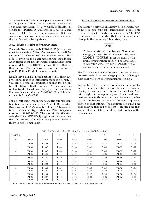 Octal codes for each registration number can be found through this FAA web page . The Mode “S” Code is displayed after the new aircraft registration number is entered. The eight digits are placed in the top row of the chart below to ascertain the correct jumpers.