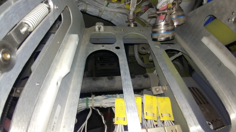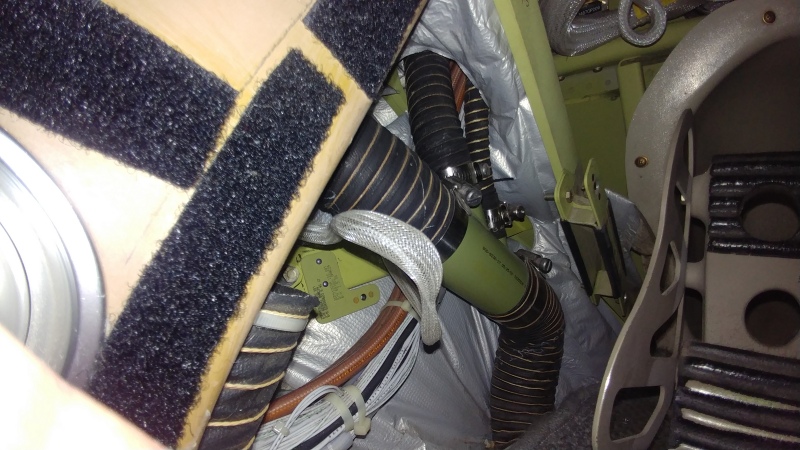 With the lower side-wall pulled off, it could be seen that the air from the cooling fan was split into three user systems. The large tube going to an adjustable vent for the crew (L/H vent), the mid-sized tube going to the multifunction displays, and the small tube routed to the glare-shield.