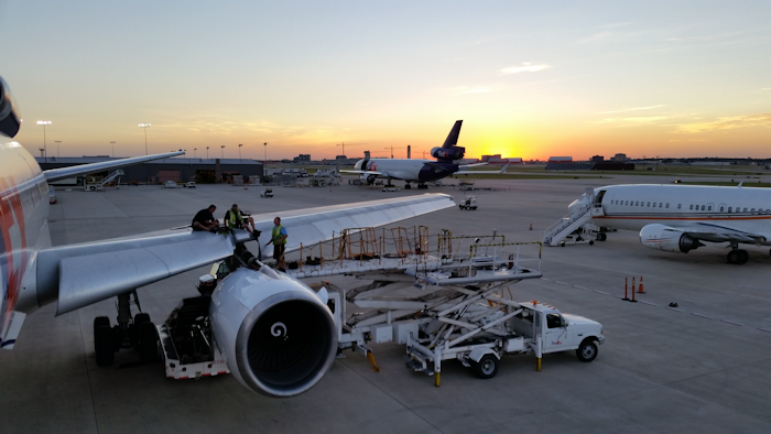 Road trip to San Antonio. MD-10-10 which had a bleed air duct in the #1 pylon split open. One of the pylon blow-out panels must of knife-edged itself into the pylon notch-flap (really a slat and I'm sure there's an official name for it, but I'm to lazy to look it up).