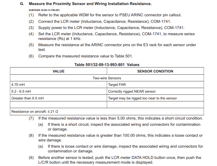 In the case of targets near and far, these seem to fall within the readings shown in the first chart. As to what might cause the PSEU (Proximity Sensor Electronics Unit) to fail a sensor, we'll have to experiment on an aircraft one day. I would guess that laying a target directly on the sensor causing a high mH reading should be a failure.