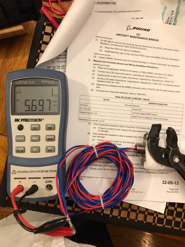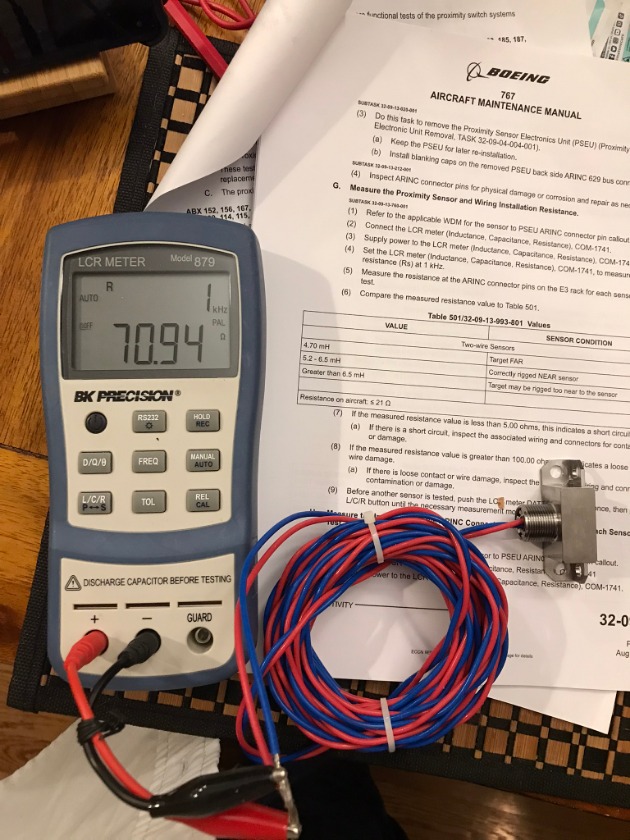 Resistance with the LCR meter is way out of anything stated by the manual. I'm going to trust our readings before the manual. The following images show actual results on the aircraft and in the shop.