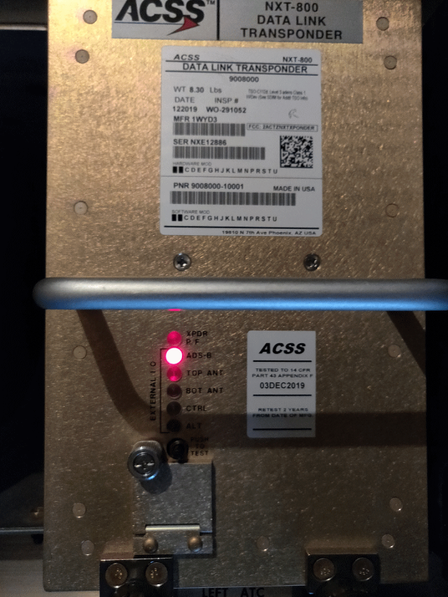 An ADS-B fault light was also present on the face of the transponder while performing a self test.