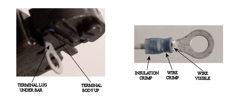 - A good terminal connection will have two properly placed crimps along with the wire visible on the lug side of the terminal.