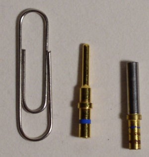 - Female pins without wires can be assisted out of the plug with a paper clip or stick pin from the front side. The push rod from a front removal tool is helpful with male pin removal. The rod tip is concave, it can push the pin up enough to grab the base from the backside (fingers only, do not use pliers).