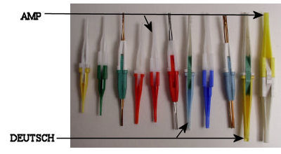 The standard ranges of pin sizes are red, blue, and yellow. Red pins for gauges 18-22 receive the majority of use. The most common purpose is for signal wires. The larger blue and yellow pins are found for power functions. It is not uncommon to find intermixing of pin sizes in the same plug.